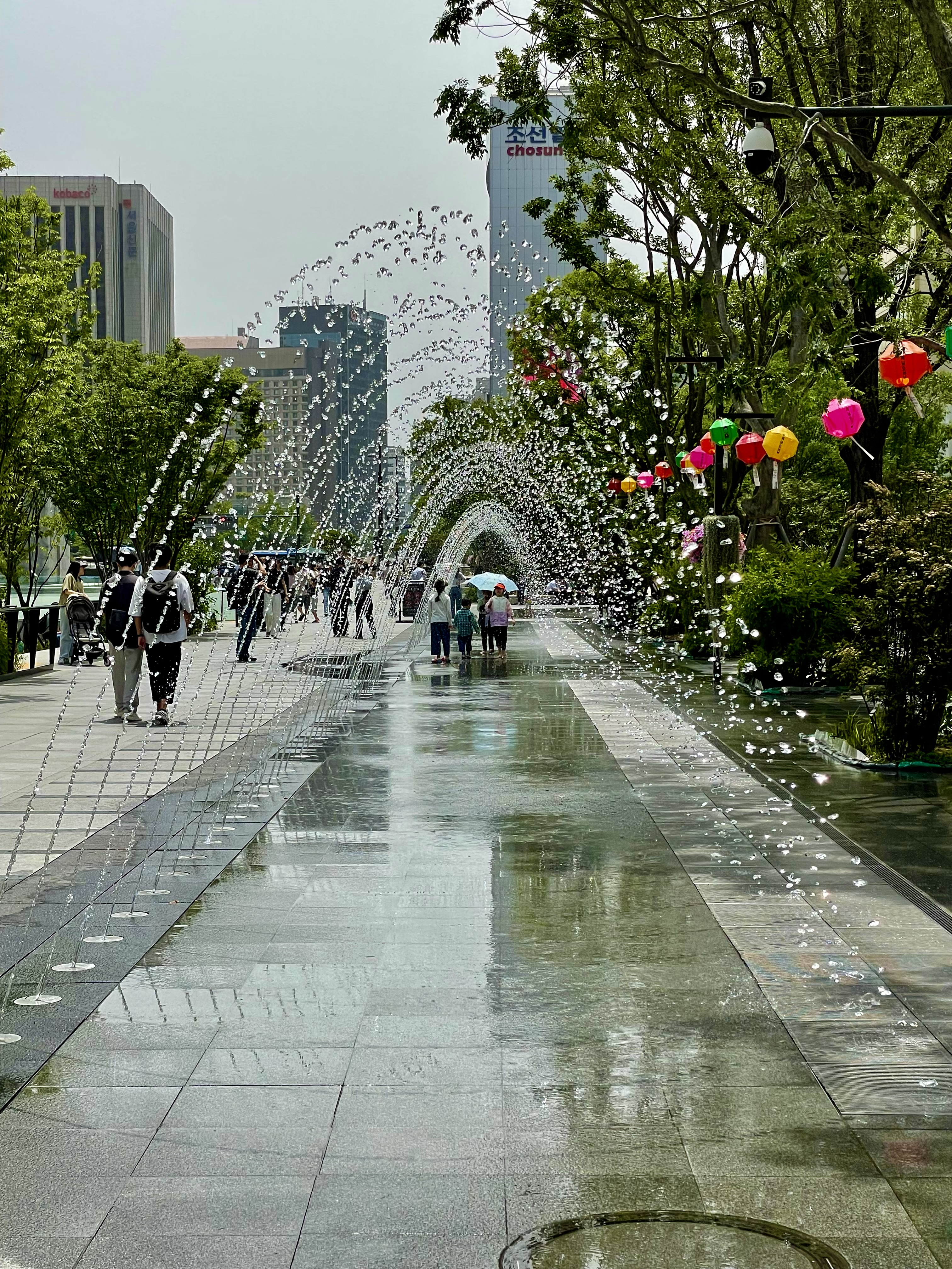 During our first trip in May 2023, the large and intricate lanterns for the annual Lantern Festival– in celebration of Buddha’s birthday–were on display in the square. We wandered between them and took lots of fun photos. At the request of our Korean language teacher, we also made sure to stop and bow to King Sejong, saying “고맙습니다” (go-mab-seub-ni-da), which means “thank you,” for creating the Hangeul Alphabet, now known for being the most logical alphabet in the world. At the risk of getting soaking wet, I even took my chances running through one of the many fountains in the square for a chance to cool off.