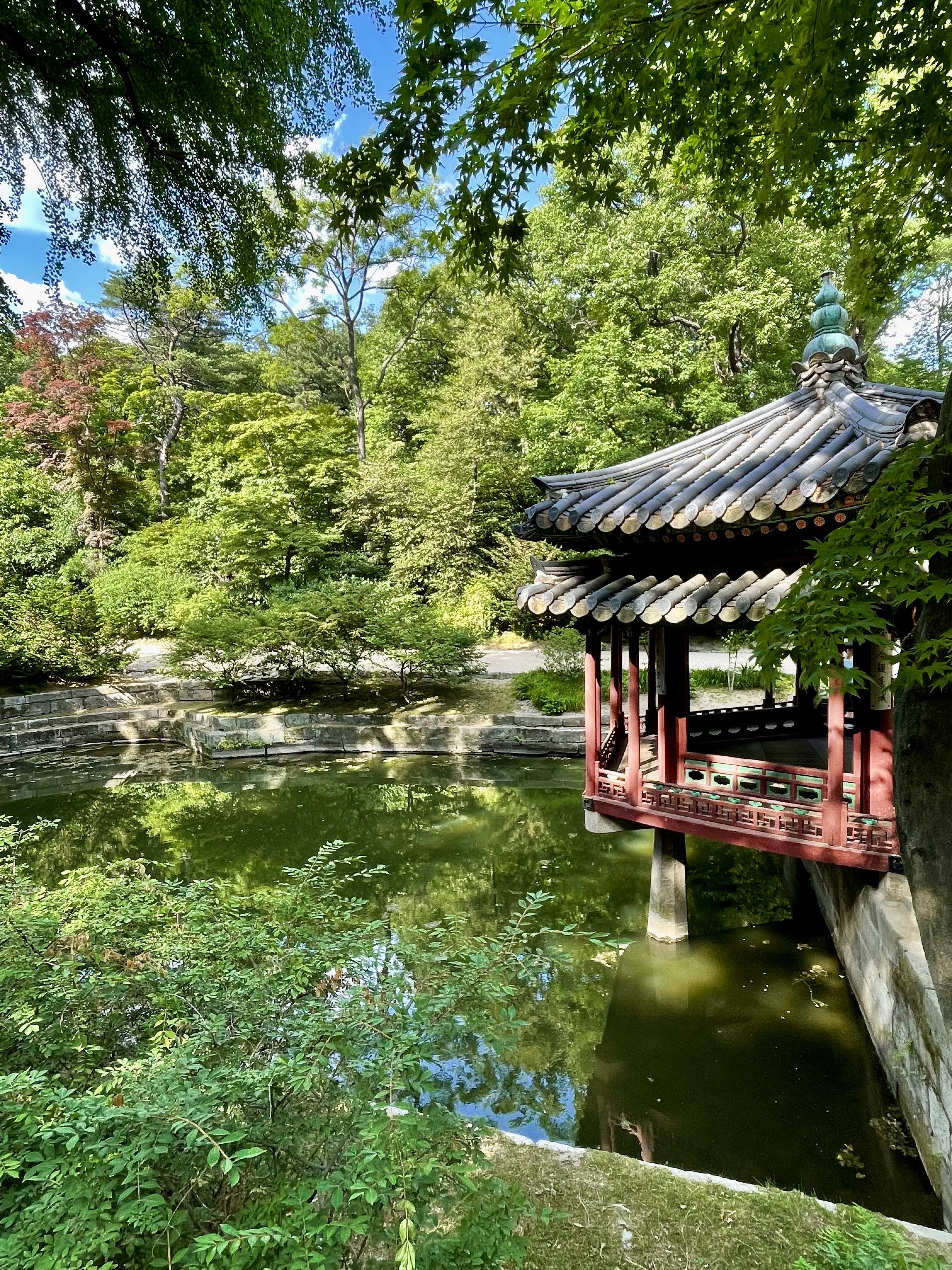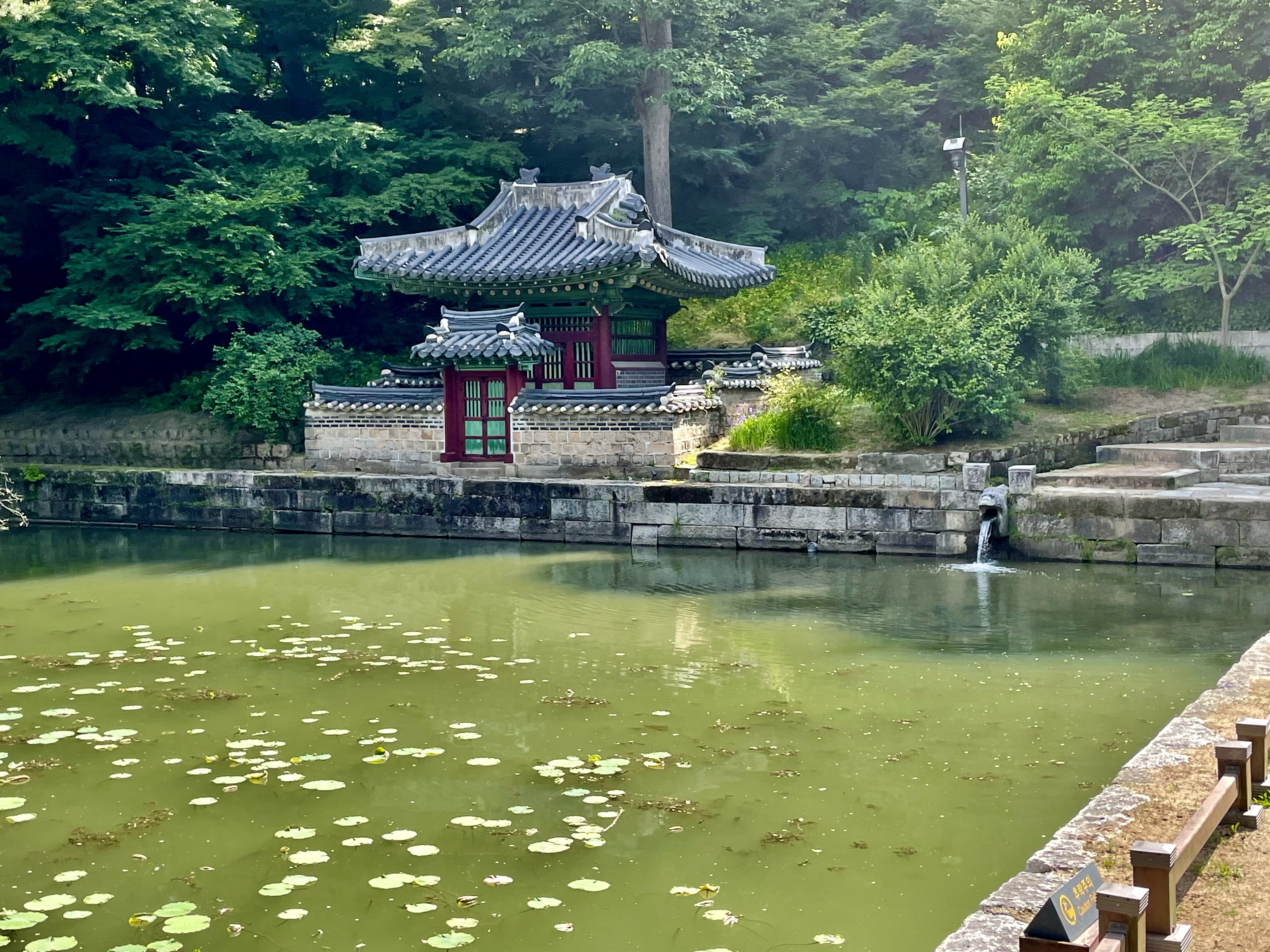 Changdeokgung’s Secret Garden is huge! It is a 78-acre park, full of lotus ponds, ancient trees, flowers, and beautiful pavilions. The setting for each of the 28 pavilions is unique. You have to walk up and down a lot of hills to enter each of the pavilion areas but they are all so different you won’t want to miss any of them. Alyssa and I both loved the two-story Juhamnu Pavilion which was built to store the writings of the king. This library is built at the top of a hill with a large pond in front, and buildings on each side. It is a privilege to visit such a gorgeous setting and special place. If I were royalty, I would definitely have spent time reading books here!